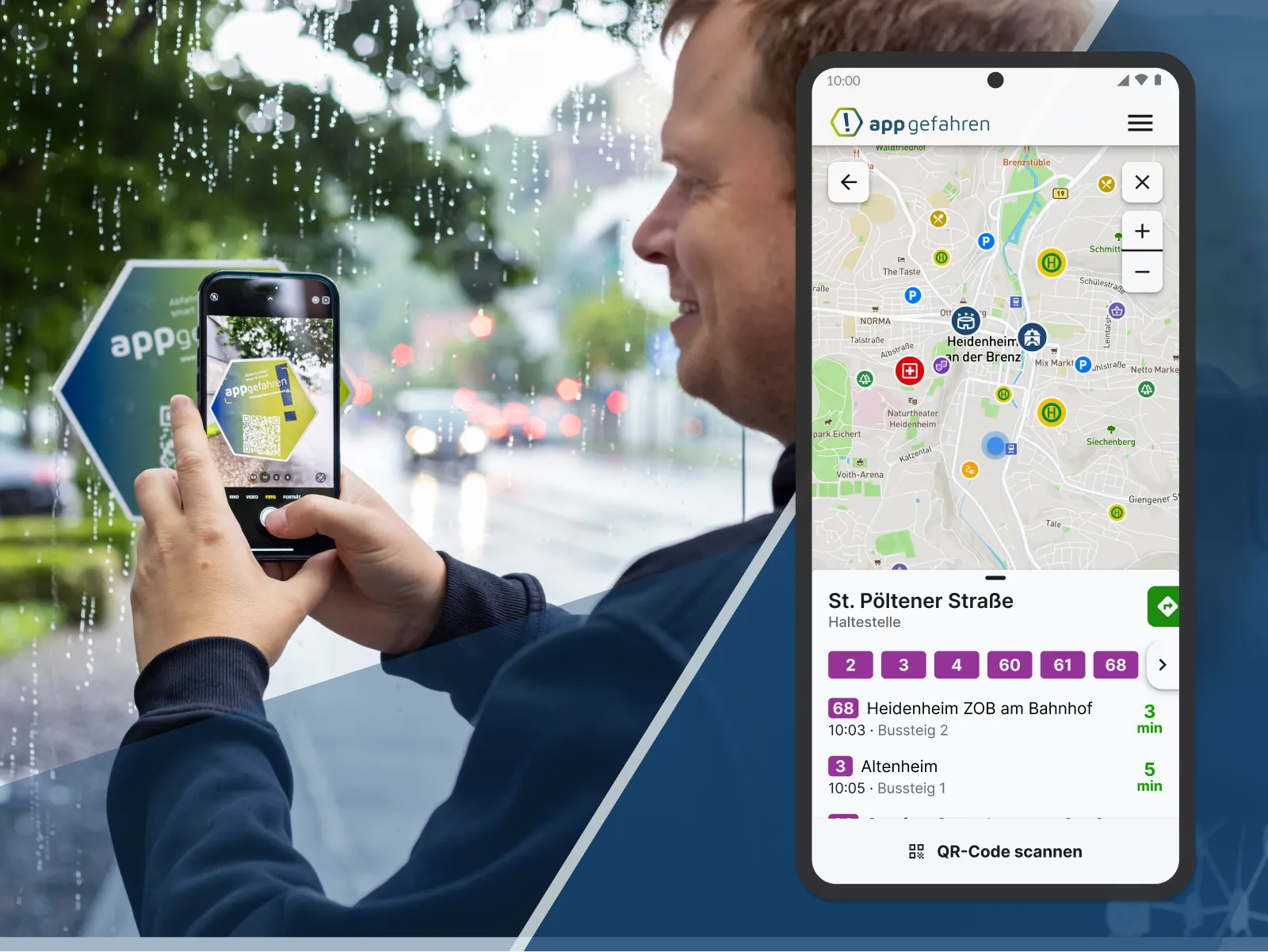 Die Idee ist einfach, aber praktisch. An jeder ÖPNV-Haltestelle findet sich ein QR-Code, über den Appgefahren mitsamt Abfahrtsmonitor aufgerufen wird. Dieser informiert in Echtzeit über die aktuellen Abfahrtszeiten sowie Verspätungen und Ausfälle. Was sonst viel Technik und Budget benötigt, um digitale Auskunftstafeln zu installieren, wird hier durch einen einfachen QR-Code ersetzt und aufs Smartphone ausgelagert.