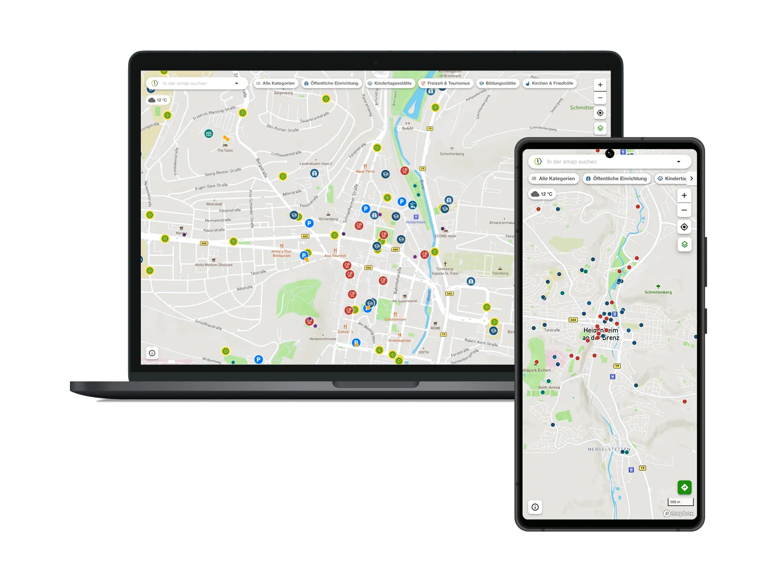 Appgefahren ist ein neuer digitaler Bürgerservice der Stadt Heidenheim an der Brenz, der einen digitalen Abfahrtsmonitor in Echtzeit mit weiteren Bürgerservices wie Öffnungszeiten kommunaler Einrichtungen oder die Verfügbarkeit von E-Ladestationen kombiniert. Die Anwendung beruht auf unserer smart mobility map (kurz: smap), einer digitalen Kartenanwendung, die es ermöglicht, wichtige Orte übersichtlich und dynamisch filterbar darzustellen und mit Zusatzinformationen sowie weiteren nachhaltigen Verkehrsalternativen zu kombinieren.